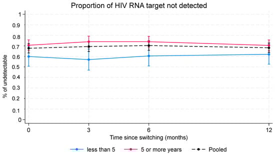 The analysis of TND was conducted using a mixed logistic regression model, chosen for its robustness in modeling variations in repeated measures that are inherently correlated. This approach allowed us to model the proportion of TND (a binary variable) over time following the treatment switch. The model included the following components: (a) a random intercept at the patient level to account for the correlation of repeated measures from the same patient; (b) TND as the binary dependent variable; (c) time during follow-up (a categorical 4-level primary predictor) to model the variation in TND proportions over time; (d) time of the last detectable HIV-RNA (>50 copies/mL, a 2-level categorical variable: ≤5 years or >5 years), included as a potential effect modifier; (e) full categorical interaction between follow-up time and the last detectable HIV-RNA, to account for effect modification; (f) a set of additional potential confounders, including age (continuous variable), sex (binary variable), and CD4 cell nadir (binary variable, ≤200 cells/mm3 or >200 cells/mm3).