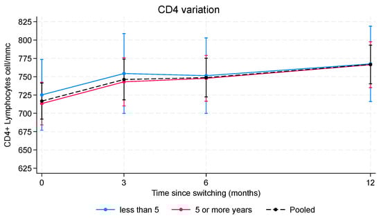 We found no significant differences in mean CD4 counts between the groups at any FU time (p = 0.966). Overall observed mean variation in CD4 in the pooled group increased from 716.69 cells/µL (SE 12.54) to 766.62 cells/µL (SE 13.46), with a significant mean increase of 49.93 cells/µL (95% CI 31.07–68.79; p < 0.001).