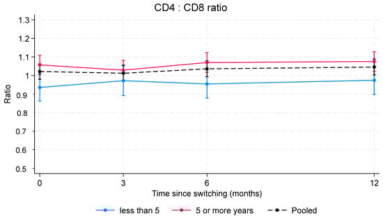The analysis for variation in CD4/CD8 ratio (Figure 4) showed an increasing trend in CD4/CD8 ratio over time in PLWH who were virologically suppressed for less than 5 years. In these subjects, the mean CD4/CD8 ratio increased over time from 0.94 (SE 0.04) to 0.97 (SE 0.04), with a mean increase of 0.04 (95% CI 0.00–0.08; p-value 0.061).