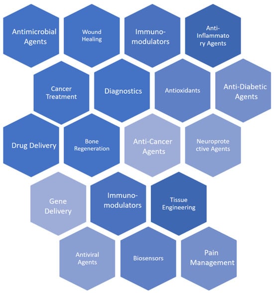 | Silver (Ag) | Nanoparticles, nanowires | Antimicrobials, wound healing, electronics | Broad-spectrum antimicrobial activity, electrical conductivity | [1,5,8] |