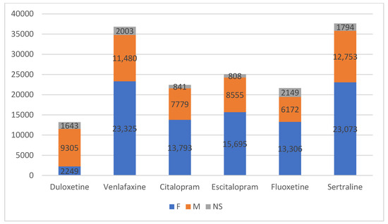For the analyzed medications, sertraline was associated with the highest number of ADRs (37,620 reported cases). Subsequently, the drugs most frequently reported to cause ADRs were, in order, venlafaxine (36,808 cases), duloxetine (33,438 cases), and escitalopram (25,058 cases). The least frequently reported adverse effects were associated with citalopram (22,413 cases) and fluoxetine (21,627 cases) (Table 2).