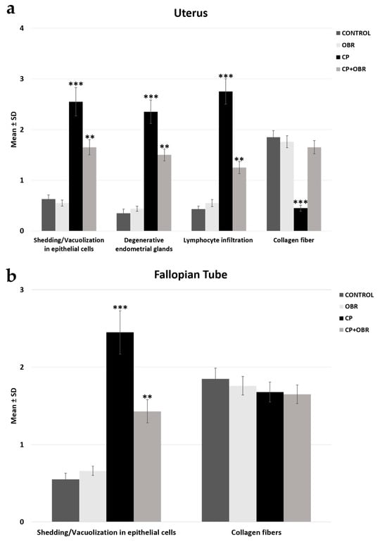 The evaluation of histopathological parameters, shedding/vacuolization in epithelial cells, degenerative endometrial glands, lymphocyte infiltration, and collagen fiber of the uterus (a) and fallopian tube (b) across the control, OBR, CP, and CP + OBR groups. ** p < 0.01, *** p < 0.001.
