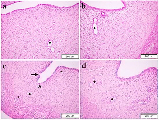 Histopathological examination of the uterus by H&E staining in control (a), OBR (b), CP (c), and CP + OBR (d) groups. Scale bars: 200 µm. Endometrial glands (◆), shedding epithelial cells (arrow), vacuolization in epithelial cells (arrowhead), lymphocyte infiltration areas (*).