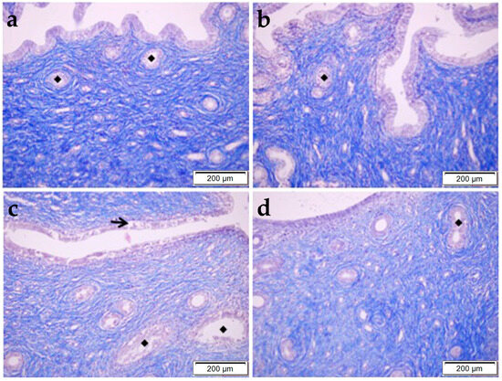 Histopathological examination of the uterus by MT staining in control (a), OBR (b), CP (c), and CP + OBR (d) groups. Scale bars: 200 µm. Endometrial glands (◆), shedding epithelial cells (arrow).