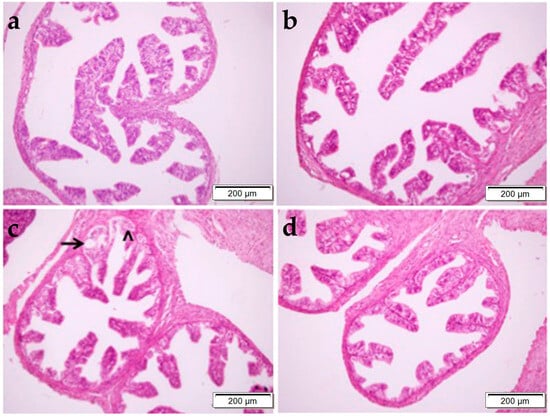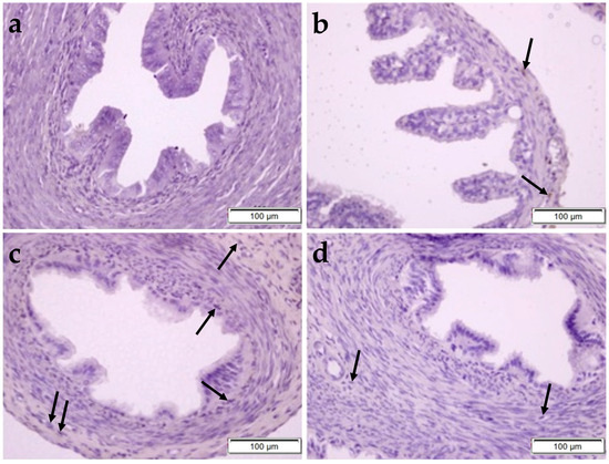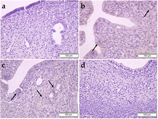 H&E staining were used to determine the histopathological changes (Figure 1 and Figure 2). In the control group, the endometrial layer exhibited its normal histological structure through the presence of single-layered columnar epithelial cells, blood vessels, and endometrial glands with smooth luminal structures in the connective tissue (Figure 2a). In the OBR group, the histological structure of the uterus was similar to the control group (Figure 2b). But, in the CP-administered group, shedding and vacuolization in epithelial cells, degenerative endometrial glands, and lymphocyte infiltration areas in the connective tissue were observed. The tissue damage was reduced by administering BA together with the CP, and the uterus structure was found to be similar to the control group (Figure 2d).