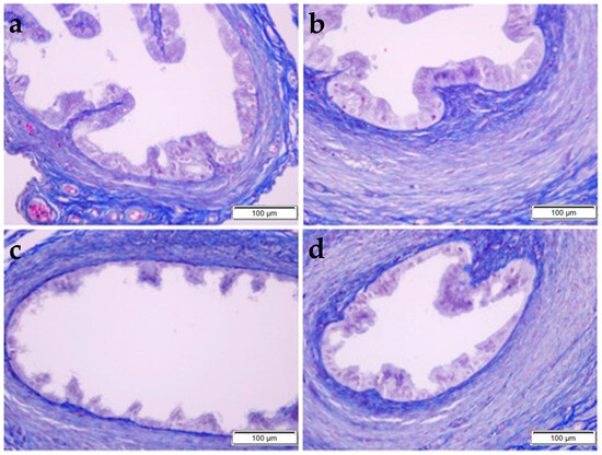 Histopathological examination of the fallopian tube by MT staining in control (a), OBR (b), CP (c), and CP + OBR (d) groups. Scale bars: 100 µm.