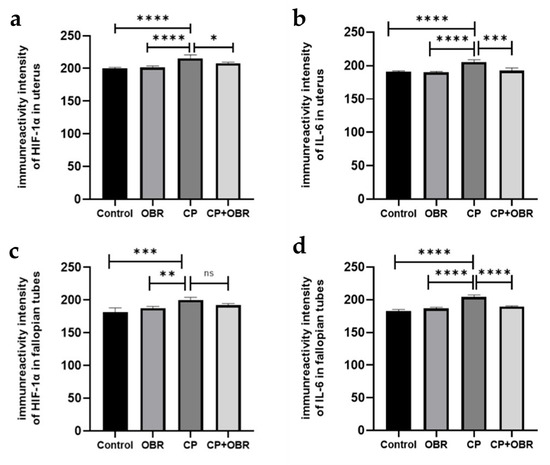 The statistical analysis of HIF-1α (a,c) and IL-6 (b,d) immunoreactivity in the uterus and fallopian tubes from the control, OBR, CP, and CP + OBR groups. * p < 0.05, ** p < 0.01, *** p < 0.001, **** p < 0.0001; ns, not significant/p < 0.05.