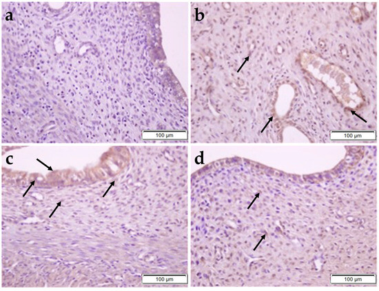 The immunoreactivity of IL-6 in rat uterus from the control (a), OBR (b), CP (c), and CP + OBR (d) groups. Scale bars: 100 µm. Immunopositive cells (arrows).
