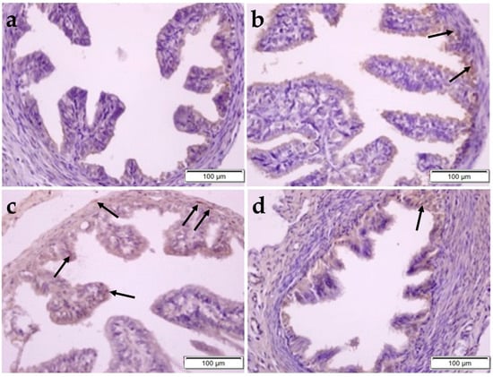 In order to determine alterations in HIF-1α and IL-6 immunoreactivity within the uterus and FT, the avidin-biotin-peroxidase method was used in accordance with the instructions provided by the manufacturers (Santa Cruz Biotechnology, Dallas, TX, USA, and Bioss Inc., Woburn, MA, USA). The sections were briefly washed in deionized water, rehydrated, and put in a microwave for five minutes at 95 °C in 0.01 M sodium citrate buffer (pH 6.0) for antigen recovery. Hence, the sections were washed in phosphate-buffered saline (PBS). They were treated with 3% hydrogen peroxide to inhibit endogenous peroxidase activity. The subsequent steps were performed using the Ultra Vision Detection System staining kit (Thermo Fisher Scientific, Waltham, MA, USA), in accordance with the manufacturer’s instructions. In order to avoid non-specific staining, the sections were treated in the Ultra V block for 10 min, then incubated with primary antibodies, anti-HIF-1α and anti-IL-6, overnight at 4 °C. After washing with PBS, they were treated with biotin-streptavidin hydrogen peroxidase secondary antibodies for 10 min, and they were washed in PBS. Sections were stained with 3,3′-diaminobenzidine tetrahydrochloride (DAB) for 10 min to make immunoreactivity visible. And Gill’s hematoxylin procedure was performed for counterstaining. After alcohol and xylene applications, the sections were mounted. In order to acquire immunohistochemical images, a light microscope (BX51, Olympus, Tokyo, Japan) was utilized. The immunoreactivities of HIF-1α and IL-6 were determined using the ImageJ.JS v0.5.8 Software (National Institutes of Health, Bethesda, MD, USA) on ten randomly selected fields.