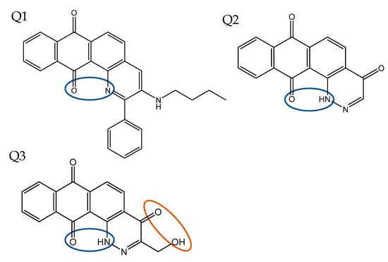 The structures of the anthraquinones 2-phenyl-4-(butylamino)naphtho[2,3-h]quinoline-7,12-dione (Q1), 4-hydroxynaphto[2,3-h]cinnoline-7,12-dione (Q2) and 3-(hydroxymethyl)naphto[2,3-h]cinnoline-4,7,12(1H)-trione (Q3). The chelating sites are marked with an oval shape drawing.
