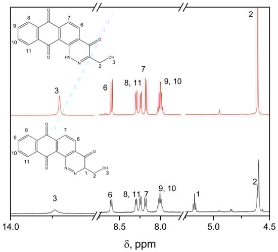 1H NMR spectra of 4-hydroxynaphto[2,3-h]cinnoline-7,12-dione (Q2) in DMSO-d6. The signals between the chemical shift (δ) 8 and 8.6 ppm belong to aromatic protons of the quinone, and the broad signal at 13.9 ppm corresponds to an -NH proton (2-H). Deuterated solvent was used as a standard. Details on spectral parameters are given in Section 3.2.