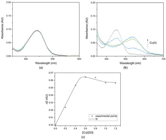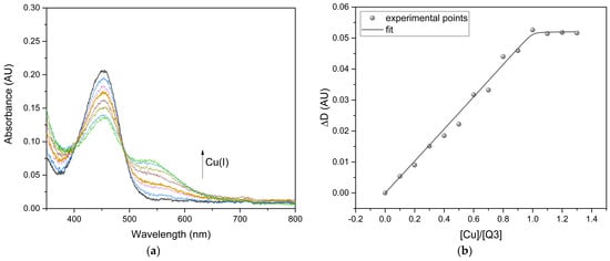The complex formation of Q3 with Cu(I) ions (CuCl) was also studied in ethanol using UV–Vis spectroscopy. In this case, a decrease in absorbance at 450 nm and an increase of absorbance at 550 nm with increasing Cu(I) concentration is observed (Figure 6). The presence of isosbestic points and the saturation of ∆D at the chelator–metal ratio is approximately equal to 1, indicating that the cuprous ion complex has the stoichiometry 1:1 (chelator–metal).