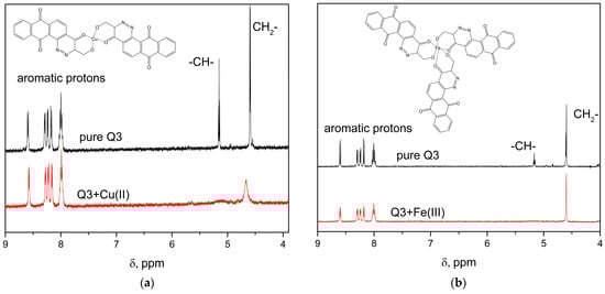 The results obtained in this study indicate that the interaction of Q3 with Cu2+ and Fe3+ ions in DMSO, as well as with Fe3+ in ethanol, does not affect the transitions in the π-system of the quinone. Q3 potentially contains two chelating centers, as shown in Figure 1, one in the aromatic part of the molecule and one in the aliphatic part; while Q2 contains only one chelate center, which is located in the aromatic part. UV–Vis spectroscopy data for Q2 indicate that this quinone derivative does not demonstrate metal chelating ability. Furthermore, additional NMR experiments were carried out, due to the possibility that Q3 may form complexes via another chelate center. In this context, the 1H NMR spectra of Q3 in the presence and in the absence of cupric ions (CuCl2) in DMSO is shown in Figure 7a. It is notable that, in the presence of Cu(II) ions, significant broadening is observed for the signals of CH2 and CH protons of the Q3 side chain. This broadening appears to be caused by the close position of these protons to the metal ion in the chelate center. At the same time, no broadening was observed for the aromatic protons of Q3. This finding suggests that the metal complex formation in DMSO happens via interactions with oxygen (Figure 7a). The same results were obtained in the interaction of Q3 with ferric ions Fe3+ (Fe(NO3)3, Figure 7b). The stoichiometry of complexes was determined by the determination of the “saturation” metal concentration, after which no changes in the spectra were observed. For Cu(II)-Q3, the stoichiometry (metal–chelator) was 1:2, and for Fe(III)-Q3 the stoichiometry (metal–chelator) was 1:3. Schematic structure of the complexes with these stoichiometries are shown in Figure 7.