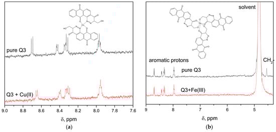 1H NMR spectra of 0.5 mM 3-(hydroxymethyl)naphto [2,3-h]cinnoline-4,7,12(1H)-trione (Q3) in CD3OD (a) in the absence and in the presence of 0.25 mM cupric chloride (CuCl2), (b) in the absence and in the presence of 0.17 mM Fe(NO3)3 (The chemical shift (δ) is shown in the horizontal axis). Deuterated solvent was used as standard.