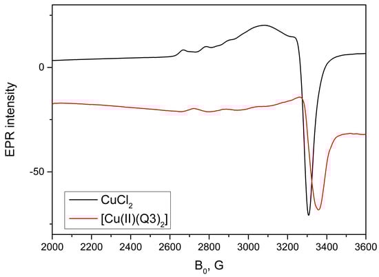 These findings suggest that the metal complex formation in DMSO takes place via the chelate center containing the OH-group. Furthermore, it explains the absence of changes in the UV–Vis spectra since, in this case, the π-system transitions are not affected. At the same time, changes to the UV–Vis absorption spectra in ethanol means that the complex formation takes place via a chelate center containing an NH group (Figure 8), affecting the π-system transitions. The NMR spectra of the mixture of Q3 (0.5 mM) and CuCl2 (0.25 mM) in deuterated methanol are shown in Figure 8. In contrast to DMSO, line broadening and shift of aromatic protons of Q3 is observed in the presence of CuCl2, indicating that cupric copper ions are placed closer to the aromatic fragment. Additional experiments were performed to confirm the oxidation state of copper using electron paramagnetic resonance (EPR). The EPR spectra of CuCl2 and [Cu(Q3)2] complex in DMSO are given in Figure 9. The characteristic signal of Cu(II) was observed in the complex. The difference between the EPR spectrum of the copper (II) salt and the copper(II) complex with the chelator Q3 can be shown, since the linewidth and g-value are clearly different. The change of these magnetic parameters is caused by the influence of the chelators on the electronic structure of the copper(II) ion [57,58]. The presentation of iron ions in the EPR spectrum is often problematic because of the short electron spin relaxation time by these ions. In this context, fast spin relaxation translates into broadening of the EPR line and a corresponding decrease of its intensity, which is inversely proportional to the square of the linewidth.