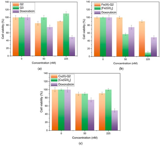 The results of the cell studies using the quinones Q2 and Q3, as well as their iron or copper complexes are represented in Figure 10. Doxorubicin was used as a positive control. It appears that both the quinones, as well as their complexes with copper ions have not caused a significant decrease in cell viability (Figure 10 a,c). However, under the same conditions, it appears that only the ferric complex of Q3 ([Fe(Q3)3]) induces a significant decrease in cell viability; whereas, by contrast, the mixture Fe(III)-Q2 has no effects under the same conditions (Figure 10b).