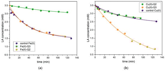 The kinetics of cupric copper-mediated LA peroxidation in the presence of Q2 and Q3 are shown in Figure 11b. It also appears in this case that there is no effect of Q2 on the rate of lipid peroxidation, which is similar to the case of ferrous iron ions. By contrast, Q3 significantly increased the rate of LA oxidation in the presence of cupric copper ions. The same result was previously observed using Q1 [42]. The estimation of the rate constants of the reactions are given in Table 3.