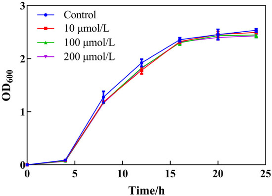 Effect of different concentrations of Y0-C10-HSL on the growth curve of P. aeruginosa. Bacteria were cultured in a PPGAS medium at 37 °C and 150 rpm for 24 h under 0, 10, 100, and 200 μmol/L Y0-C10-HSL, respectively. OD600 was measured every 2 h.