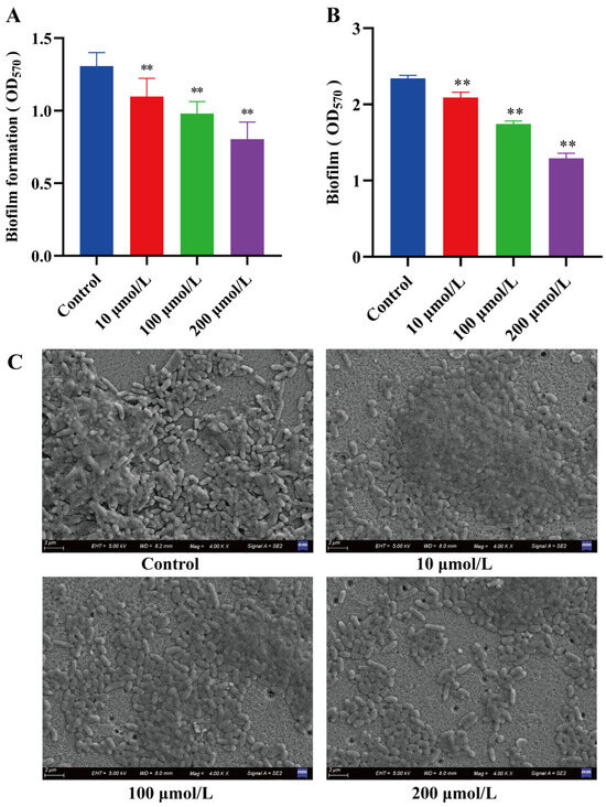 The coverslips were autoclaved and placed in the 6-well plate. Then, 2000 μL of bacterial suspension (1 × 107 CFU/mL, containing 0, 10, 100, and 200 μmol/L Y0-C10-HSL, respectively) was added to each well. Each group was set three parallels. After static incubation at 37 °C for three days, the medium was removed and the biofilm was rinsed. The rinsed biofilm was fixed with 2.5% glutaraldehyde overnight. Subsequently, the biofilm was washed and dehydrated with gradient ethanol (50%, 70%, 80%, 90%, 95%, 100%) for 15 min [56,57]. Finally, the biofilm was dried with a vacuum freeze dryer (Xinzhi, Scientz-30YG/A, Ningbo, China), and the morphology and structure of the biofilm was observed with SEM (ZEISS GeminiSEM 500, Carl Zeiss, Oberkochen, Germany), where the magnification was 4000× [58].