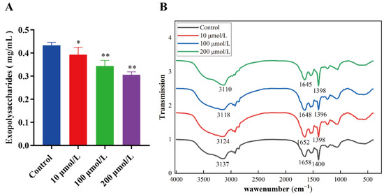 Exopolysaccharides are the primary component of bacterial biofilm and play a pivotal role in its development. As a member of the biofilm matrix, P. aeruginosa is capable of secreting three types of exopolysaccharides, namely alginate, Pel, and Psl, each serving a unique function in facilitating biofilm development and evading immune responses during infection [25,26]. The effect of Y0-C10-HSL on the exopolysaccharides of P. aeruginosa is shown in Figure 4A. In comparison to the control group, the production of exopolysaccharides was significantly inhibited by Y0-C10-HSL (p < 0.05). The inhibition rate of exopolysaccharides production was 9.63%, 20.76%, and 29.3% at 10, 100, and 200 μmol/L, respectively. FT-IR is a widely employed technique for the analysis of functional groups. Previous studies have demonstrated a strong correlation between the peak intensity in the infrared spectrum and the concentration of functional groups within samples, thereby enabling an accurate reflection of their relative concentrations. As illustrated in Figure 4B, many absorption peaks were identified within the 500~4000 cm−1 range. The corresponding infrared absorption peaks in the control group and the treatment groups with different concentrations were observed to be in similar positions, indicating that the major functional group classes were basically identical. The peaks observed at the 3400 cm−1 beams of the spectrum are typically attributed to the stretching vibration of O-H and N-H groups. The hydroxyl compounds can associate, which causes the absorption peak of the O-H group to shift towards the lower wave number. It has been reported that the absorption peaks at 1600~1700 cm−1, 1500~1600 cm−1, and 1200~1300 cm−1 are produced by the amide I band, amide II band, and amide III band, respectively, which are closely related to the protein group [27,28]. The absorption peak at 1400 cm−1 is attributed to the stretching vibration of C=O, which is linked to the bacterial cell wall peptidoglycan and capsule. When treated with different concentrations of Y0-C10-HSL, the vibrational characteristics at each wave number exhibited changes. A broad and intense absorption peak emerged in the range of 3400 to 3100 cm−1, attributed to O-H stretching vibrations, indicating the presence of polysaccharides within EPS. In comparison to the control group, significant alterations were observed in the vibrational characteristics for the treatment groups at concentrations of 10, 100, and 200 μmol/L. Notably, the characteristic absorption peak of polysaccharides shifted from 3137 cm−1 to 3124 cm−1, 3118 cm−1, and 3110 cm−1, respectively. The peaks associated with the amide I band resulting from C=C and C=O stretching vibrations also demonstrated a shift from 1658 cm−1 to values of 1652 cm−1, 1648 cm−1, and 1645 cm−1. Furthermore, a notable alteration was observed at around 1400 cm−1, where the intensity of the peak gradually decreased with an increase in Y0-C10-HSL concentration. To summarize, Y0-C10-HSL mainly impacts the O-H, N-H, C=C, and C=O functional groups on the EPS surface.