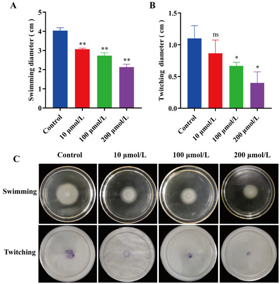 Motility plays a significant role in the initial attachment of bacterial cells to both biological and abiotic surfaces, thereby facilitating biofilm formation. Swimming and twitching motilities are necessary factors for biofilm formation; they allow for bacterial chemotaxis, connection, and adhesion to surfaces, thus enabling biofilm formation [29,30]. We further studied the impact of Y0-C10-HSL on P. aeruginosa motility. Figure 5 shows that Y0-C10-HSL exhibited varying degrees of inhibition on swimming and twitching motilities. The effect of swimming motility of P. aeruginosa is shown in Figure 5A,C, where the results of swimming motility of P. aeruginosa showed foggy concentric circles centered on the inoculation point on the agar plate. Y0-C10-HSL exhibited a significant dose-dependent inhibitory effect on swimming motility. The inhibition rate was 24%, 32.2%, and 47.1% at the concentrations of 10, 100, and 200 μmol/L Y0-C10-HSL, respectively (p < 0.01). The result of twitching motility is shown in Figure 5B,C, where the inoculum points in the center formed a disc-like structure. The inhibition effect was relatively weak, and there appeared to be no significant difference at the concentration of 10 μmol/L (p > 0.05), while there was significant inhibition at concentrations of 100 μmol/L and 200 μmol/L Y0-C10-HSL.