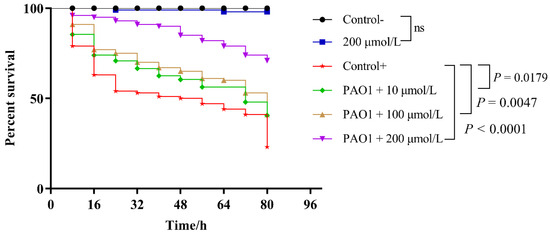 The establishment of the C. elegans infection model was based on the previously described method with slight modifications [66,67]. To begin with, NGM plates containing 0, 10, 100, and 200 μmol/L Y0-C10-HSL, respectively, were manufactured. They were inoculated with E. coli OP50 or P. aeruginosa and labeled in groups. The inoculated NGM plates were incubated for 24 h. Finally, 100 synchronized L4-stage N2 nematodes were picked onto NGM plates, sealed, and incubated in a biochemical incubator (Bruepard Instruments, Shanghai Yiheng Instrument Science Co., Shanghai, China) at 20 °C for 80 h. Observations were recorded every 8 h during the incubation period.
