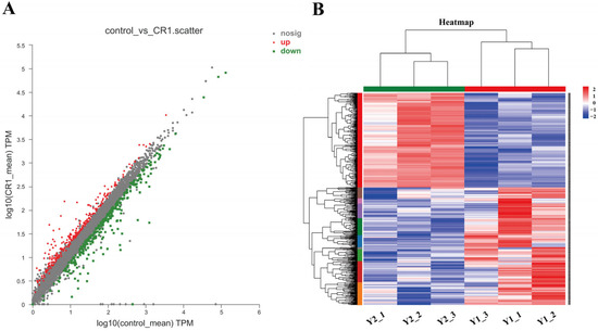 Differentially expressed gene map. (A) Scatter plot of differentially expressed genes. (B) Heat map of differentially expressed genes. Red indicates up-regulated genes, blue indicates down-regulated genes.