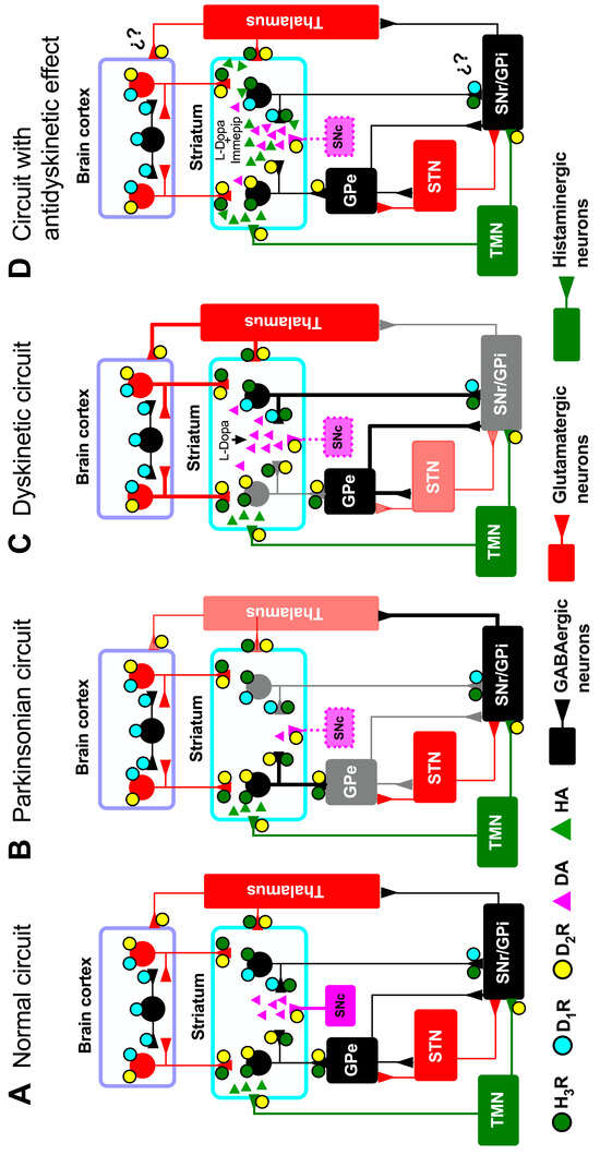 As indicated above, MSNs of the BG direct pathway co-express H3Rs and D1Rs [17], and in slices of rat substantia nigra pars reticulata (SNr) and striatum H3R activation inhibits D1R-stimulated cAMP accumulation and GABA release [20,21,22], indicating an opposite functional interaction. However, there is still limited information on whether this functional interaction affects LIDs, originating from molecular and cellular changes in the BG circuitry, with D1R overstimulation playing a causative role. In this review, we examine the reported effects of co-activating D1Rs and H3Rs on BG function and their potential influence on LIDs.