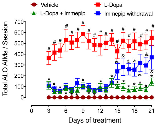 Effect of the systemic administration of the H3R agonist immepip (1 mg/kg, i.p.) on total ALO (axial, limb, and orolingual) abnormal involuntary movements (AIMs) induced by L-Dopa (6.25 mg/kg; benserazide 15 mg/kg, i.p.). ALO AIMs were individually counted and then summed per session. The statistical analysis of total AIMs was conducted with repeated-measures ANOVA followed by Bonferroni’s post hoc test (8 animals per group). &,# p < 0.01, compared to the vehicle group; * p < 0.001, compared to the L-Dopa group.