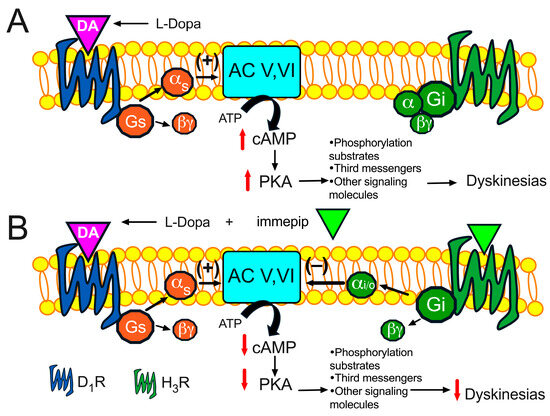 H3R activation leads to the inhibition of adenylyl cyclases (ACs) and the subsequent reduction in cAMP formation (see Figure 3) [42], and H3R activation inhibits D1R-induced cAMP accumulation in striatal slices [21]. L-Dopa administration leads to the enhanced activation of the cAMP/PKA pathway, and in MSNs expressing D1Rs, PKA phosphorylates several substrates, including DARPP-32 (DA- and cAMP-regulated phosphoprotein of 32 kDa), extracellular signal-regulated kinases (ERK-1/2), and proteins of the mTORC1 signaling pathway [4,64,65,66]. These molecular changes have been observed in MSNs of the striato-nigral direct pathway but not in MSNs of the indirect pathway [65]. In line with this, LIDs are reduced when L-Dopa administration is combined with drugs such as the PKA inhibitor Rp-cAMPS [66] or SL327, an ERK phosphorylation inhibitor [63,64]. Therefore, it is likely that the functional interaction between D1R and H3R explains the reduction in LIDs. However, molecular studies to corroborate this hypothesis are lacking.