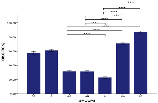 There was no significant difference in the mean Ob.S/BS % between the Baseline Control (BC) and Control (C) groups. However, the mean Ob.S/BS % was significantly decreased in the Alcohol Olive Oil (AO), Alcohol Normal Saline (AN) and Alcohol (A) groups compared to the Control groups (BC and C) (p < 0.0001). Both the Alcohol Alpha-Tocopherol (AA) and Alcohol Palm Vitamin E (AE) groups showed a significant reversal of the alcohol-induced reduction in Ob.S/BS % (p < 0.0001). These groups exhibited a significantly higher mean osteoblast surface compared to both the Control (BC and C) and alcohol-treated groups (AO, AN and A) (p < 0.0001). Furthermore, the mean osteoblast surface in the Alcohol Palm Vitamin E (AE) group was significantly higher than that in the Alcohol Alpha-Tocopherol (AA) group (p < 0.0001) (Figure 1).