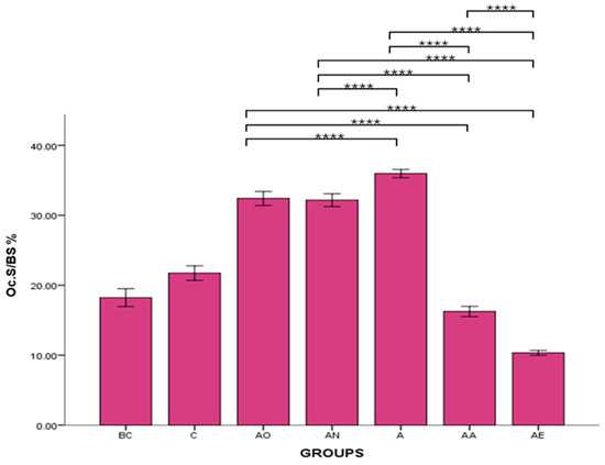 There was no significant difference in the osteoclast surface between the BC and C groups. However, the mean Oc.S/BS % of AO, AN and A groups were significantly increased compared to the C group (p < 0.0001). Conversely, the mean Oc.S/BS % for the AA and AE groups was significantly decreased compared to the C groups (p < 0.0001). Palm vitamin E supplementation led to a reduction in the osteoclast surface, which was significantly different compared to AO, AN and A groups. This effect was also observed in rats treated with alpha-tocopherol. However, there was a significant difference between the AE and AA groups, with the mean Oc.S/BS % for the AE group significantly lower than that for the AA group (p < 0.0001) (Figure 2).