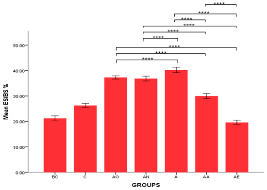 There was no significant difference in the mean ES/BS % between the Baseline Control (BC) and Control (C) groups. However, the mean ES/BS % of the Alcohol Olive Oil (AO), Alcohol Normal Saline (AN) and Alcohol (A) groups was significantly increased compared to the Control groups (BC and C) (p < 0.0001). Conversely, the mean ES/BS % for both the Alcohol Alpha-Tocopherol (AA) and Alcohol Palm Vitamin E (AE) groups was significantly decreased compared to the Control groups (BC and C) (p < 0.0001). Alpha-tocopherol (AA) and palm vitamin E (AE) supplementation were able to reverse alcohol’s effect and caused a significant decrease in eroded surface compared to the AO, AN and A groups. Additionally, the mean ES/BS % for the AE group was significantly decreased compared to the AA group (p < 0.0001) (Figure 3 and Figure 4).