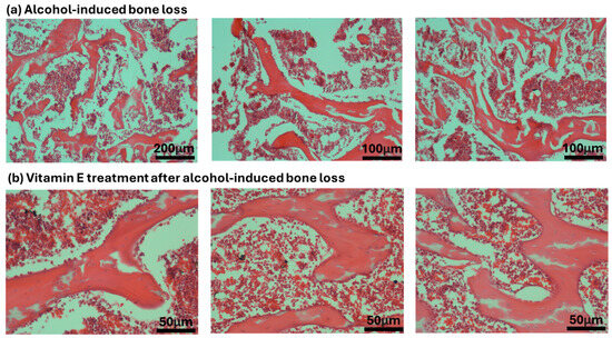 Photomicrographs of H and E stain on cellular bone histomorphometry after treatment with alcohol and vitamin E.