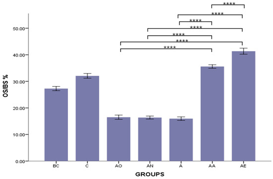 There was no significant difference in the mean OS/BS % between the Baseline Control (BC) and Control (C) groups. However, the mean OS/BS % of both the Alcohol Olive Oil (AO), Alcohol Normal Saline (AN) and Alcohol (A) groups was significantly decreased compared to the Control groups (BC and C) (p < 0.0001). Conversely, both the Alcohol Alpha-Tocopherol (AA) and Alcohol Palm Vitamin E (AE) groups had significantly higher OS/BS % compared to the Control groups (BC and C) (p < 0.0001). Both alpha-tocopherol (AA) and palm vitamin E (AE) supplementation were able to increase the osteoid volume in a significantly higher manner than in the alcohol groups (AO, AN and A). However, the OS/BS % for the Alcohol Alpha-Tocopherol (AA) group was still significantly lower than that for the Alcohol Palm Vitamin E (AE) group (p < 0.0001) (Figure 5).
