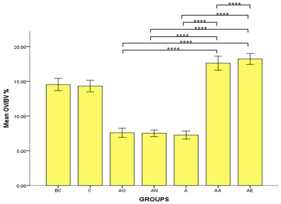 There was no significant difference in the mean OV/BV % between the Baseline Control (BC) and Control (C) groups. However, the mean OV/BV % of the Alcohol Olive Oil (AO), Alcohol Normal Saline (AN) and Alcohol (A) groups was significantly decreased compared to the Control groups (BC and C) (p < 0.0001). Conversely, both the Alcohol Alpha-Tocopherol (AA) and Alcohol Palm Vitamin E (AE) groups had significantly increased OV/BV % compared to the Control groups (BC and C) (p < 0.0001). Alpha-tocopherol (AA) and palm vitamin E (AE) supplementation were able to increase the osteoid volume in a significantly higher manner than in the alcohol groups (AO, AN and A). However, there was no significant difference in mean osteoid volume between the Alcohol Palm Vitamin E (AE) and Alcohol Alpha-Tocopherol (AA) groups (Figure 6).