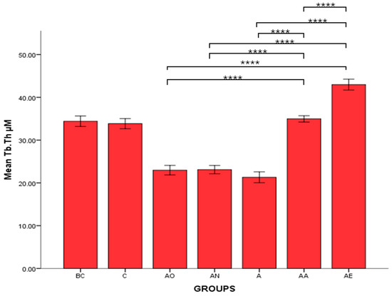 The effects of vitamin E supplementation on trabecular thickness of alcohol-induced rats. Abbreviations: BC: Baseline Control, C: Control, AO: Alcohol Olive Oil, AN: Alcohol Normal Saline, A: Alcohol, AA: Alcohol Alpha-Tocopherol, AE: Alcohol Palm Vitamin E. Mean Tb.Th: trabecular thickness. Data are presented as mean ± SEM. **** Indicates significant difference between groups (p < 0.0001).