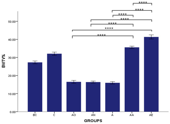 The effects of vitamin E supplementation on Bone Volume/Total Volume of alcohol-induced rats. Abbreviations: BC: Baseline Control, C: Control, AO: Alcohol Olive Oil, AN: Alcohol Normal Saline, A: Alcohol, AA: Alcohol Alpha-Tocopherol, AE: Alcohol Palm Vitamin E. Mean BV/TV: bone volume/total volume. Data are presented as mean ± SEM. **** Indicates significant difference between groups (p < 0.0001).