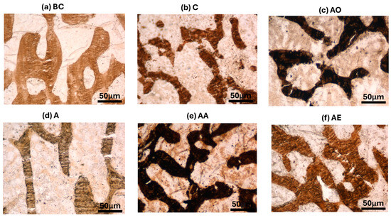 Photomicrographs of Von Kossa stain on structural bone histomorphometry after treatment with vitamin E. Abbreviation: Treatment groups: BC: Baseline Control, C: Control, A: Alcohol, AO: Alcohol Olive Oil, AA: Alcohol Alpha-Tocopherol, AE: Alcohol Palm Vitamin E.
