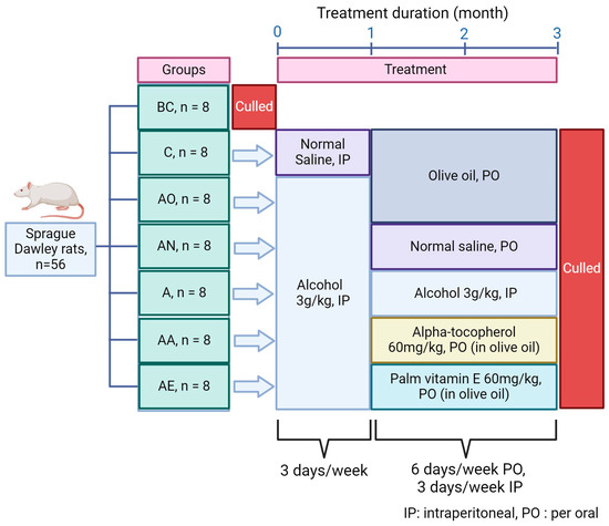 Fifty-six rats were randomly assigned to seven groups, each comprising eight individuals, as illustrated in Figure 12. These groups included baseline control (BC, euthanized without treatment), control (C, receiving normal saline for 1 month, followed by olive oil for 2 months), alcohol olive oil (AO, administered alcohol for 1 month, followed by olive oil for 2 months), alcohol normal saline (AN, exposed to alcohol for 1 month, followed by normal saline for 2 months), alcohol (A, treated with alcohol for 3 months), alcohol alpha-tocopherol (AA, subjected to alcohol for 1 month, followed by alpha-tocopherol for 2 months), and alcohol palm vitamin E (AE, treated with alcohol for 1 month, followed by palm vitamin E for 2 months). Alcohol administration involved intraperitoneal injection at a dosage of 3 g/kg, three times a week. Alpha-tocopherol and palm vitamin E were orally administered via gavage at a dosage of 60 mg/kg, six days a week.