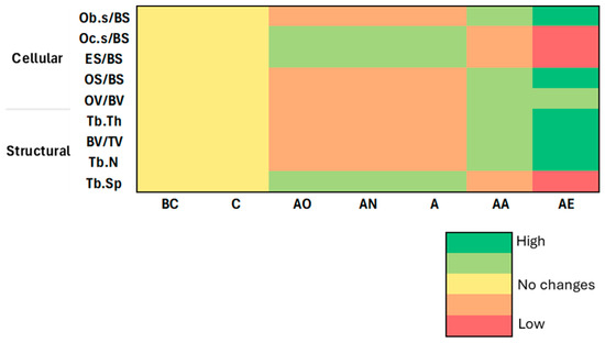 Summary of the results of the vitamin E effect on cellular and structural bone histomorphometry against both controls. Abbreviation: Cellular parameters measured: Ob.S/BS: Osteoblast surface/bone surface, Oc.S/BS: osteoclast surface/bone surface, ES/BS: eroded surface/bone surface, OS/BS: osteoid surface/bone surface, and OV/BV: osteoid volume/bone volume. Structural parameters measured: Tb.Th: trabecular thickness, BV/TV: bone volume to total volume, Tb.N: trabecular number, Tb.Sp: trabecular separation. Treatment groups: BC: Baseline Control, C: Control, AO: Alcohol Olive Oil, AN: Alcohol Normal Saline, A: Alcohol, AA: Alcohol Alpha-Tocopherol, AE: Alcohol Palm Vitamin E.