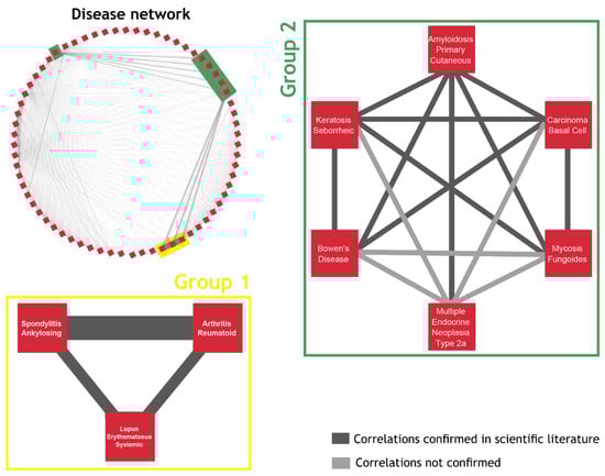 In the first approach, we constructed a second network that depicts the commonalities between the diseases. For this reason, the first neighbors of each disease were isolated, and those 76 subnetworks were all compared to each other. As a result, a 2D matrix with the number of common nodes between every pair of diseases was constructed. These numbers were used as weights in a network that connects diseases with at least one common neighbor (protein or drug) (Supplementary Table S7). The edges with zero weight were excluded from this network. The two groups of diseases that stood out from the network of diseases are discussed below. The importance of these associations was verified by reviewing the scientific literature.