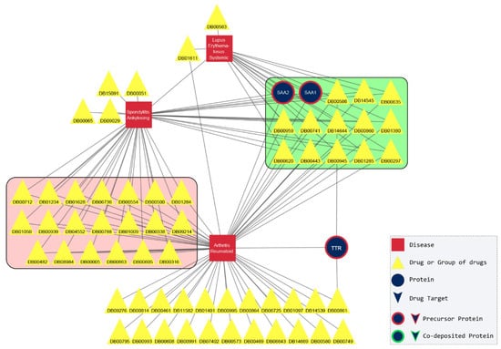 A merged network of systemic lupus erythematosus, spondylitis ankylosing, and rheumatoid arthritis subnetworks. The three diseases seem to be correlated to each other and formed a densely connected triangle that stood out from the network of diseases. Their correlation was confirmed in scientific literature. The common drugs and proteins of the three diseases are shown in the green box. The drugs in the pink box correspond to those shared between ankylosing spondylitis and rheumatoid arthritis. The proteins are labeled with their corresponding gene name and the drugs with DrugBank ID (Supplementary Materials).