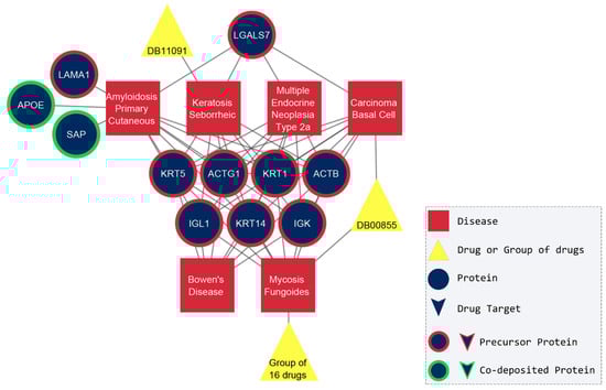 The second group of densely connected diseases that emerged included basal cell carcinoma, seborrheic keratosis, mycosis fungoides, multiple endocrine neoplasia type 2a, primary cutaneous amyloidosis, and Bowen’s disease. The main observation was that seven amyloidogenic proteins are the common nodes that connect all six diseases, as depicted in Figure 4. Even though a considerable number of publications clinically investigate the commonalities of these diseases, a systematic understanding of a molecular basis is still lacking. Nevertheless, the existing research suggests that some of these diseases mimic each other, like Bowen’s disease and seborrheic keratosis [], while the distinction between them becomes difficult, for instance, seborrheic keratosis with basal cell carcinoma or mycosis fungoides [,,,,]. In addition, the same treatment had a positive outcome in the case of basal cell carcinoma and mycosis fungoides [], and Bowen’s disease and basal cell carcinoma [,]. Surprisingly, it was already established that cutaneous amyloidosis can emerge secondarily and co-exist with all these four skin disorders []. The mechanism of the amyloidogenesis in apoptotic keratinocytes and the etiology behind cutaneous amyloidosis is not fully understood, although immunohistochemical studies have proven that the major components of cutaneous amyloid deposits are keratins (type I cytoskeletal 14—KRT14, type II cytoskeletal 1—KRT1, type II cytoskeletal 5—KRT5), actin (actin cytoplasmic 1—ACTB and 2—ACTG1), and galectin-7 (LGALS7) [,,,]. Last but not least, the sixth disease in this group, multiple endocrine neoplasia type 2a, is also associated with the most common type of cutaneous amyloidosis, the cutaneous lichen amyloidosis [,], and patients suffering from both have been documented []. In spite of the fact that multiple endocrine neoplasia type 2a have the same number of common proteins as the rest of the group, there are no scientific publications investigating their possible connection yet. In conclusion, most of our results are in accordance with the existing literature (Figure 4), as there is a growing number of studies stating that the six diseases are indeed correlated.