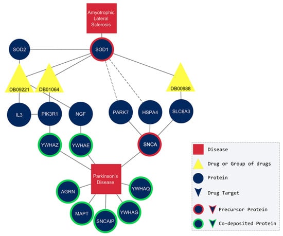 In Figure 5, it is obvious that the neighbors of the superoxide dismutase interact with proteins that participate in the subnetwork of Parkinson’s disease. For example, Isoprenaline (DB01064) and Dopamine (DB00988) interact with interleukin-3 (IL3), phosphatidylinositol 3-kinase regulatory subunit alpha (PIK3R1), beta-nerve growth factor (NGF), and sodium-dependent dopamine transporter (SLC6A3). Moreover, the superoxide dismutase interacts with medium confidence (0.700) with the Parkinson disease protein 7 (PARK7) and heat shock protein 7 (HSP7), two close neighbors of α-synuclein (SNCA). In fact, the review of Eleutherio et al. [] provided well-known information about the role of superoxide dismutase in amyotrophic lateral sclerosis and Parkinson’s disease and suggested that a common treatment should be investigated.