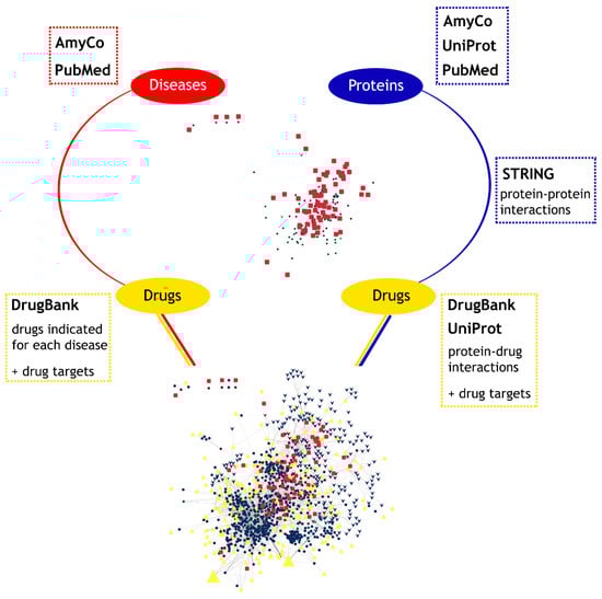 To gain a broader perspective on the available treatments in diseases associated with amyloid deposition, we constructed a heterogenous and complex disease–protein–drug network. Four different datasets were collected: the associations between diseases and the proteins found on amyloid deposits, the protein–protein interactions, the protein–drug interactions, and the drugs indicated for each disease. A brief description of the methodology for the construction of the network is presented in Figure 6.