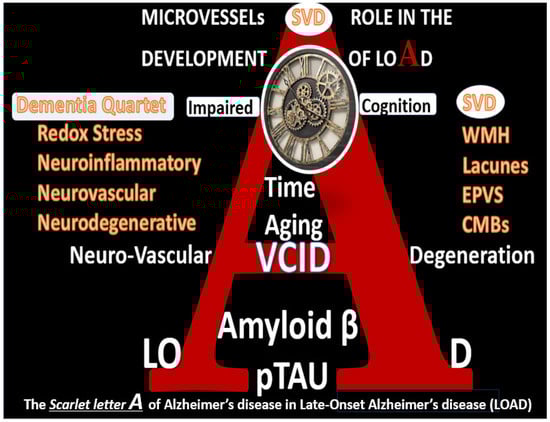 The scarlet letter A of Alzheimer’s disease in late-onset Alzheimer’s disease (LOAD). Note the dementia quartet mechanisms on the left-hand side of the figure and cerebral small vessel disease (SVD) are linked via LOAD and vascular contribution to cognitive impairment and dementia (VCID). Dementia quartet multifactorial mechanisms include (1) oxidative redox stress; (2) neuroinflammatory; (3) neurovascular; (4) neurodegenerative mechanisms in the development of LOAD. Image provided with permission by CC 4.0 [10]. CMBs, cerebral microbleeds; EPVS, enlarged perivascular spaces; WMH, white matter hyperintensities; VCID, vascular contributions to impaired cognition and dementia; underlining, indicates emphasis.