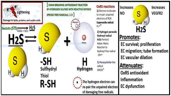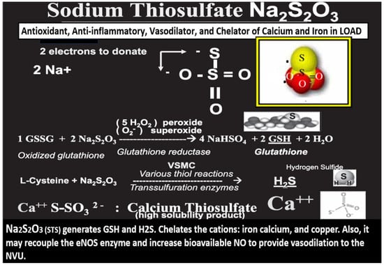 STS (Na2S2O3) acts as a potent antioxidant reducing agent with its readily available and donatable two unpaired electrons that are capable of quenching the unpaired electrons of reactive oxygen species such as superoxide (O2−), hydrogen peroxide (H2O2) or hydroxyl group (−OH), and peroxinitrite (ONOO−) while it also is capable of being converted to the vasodilating gasotransmitter and neurotransmitter modulator hydrogen sulfide (H2S) and the antioxidant glutathione (GSH) (Figure 3) [24,30].