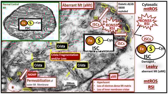 Aberrant mitochondria (aMt) are a source for multiple damaging reactive oxygen, nitrogen, and sulfur species (RONSS) that comprise the reactive species interactome (RSI). The RSI is a complex network of interactions between reactive species and their biological targets. aMt can be identified due to their hyperlucency, with loss of Mt matrix electron density with fragmentation and loss of cristae. Also note the iron (red), sulfur (yellow)–cysteine (Cys) clusters (ISCs) that are liberated from the aMt in addition to the RONSS as a result of aMt remodeling with the formation of mitochondrial outer membrane (yellow lines) permeabilization (MOMP) (red-dashed line and open arrows) with the creation of leaky Mt that leak ROS, RONSS, and ISCs. Note the insert upper left, which demonstrates a normal healthy Mt with intact ISCs that are maintained within the healthy Mt. Note the mitochondrial outer membrane permeabilization (MOMP): labeled (1) through (3), which allow the contents of the aMt to leak damaging RONSS and ISCs into the cytosol of neurons, allowing oxidative redox stress to damage lipids, proteins, and nucleic acids. Impaired mitophagy allow these leaky aMT to exist and continue to be leaky with damaging reactive species that eventually result in synaptic dysfunction and loss as well as neurodegeneration and impaired cognition. Thus, aMts are an important early and significant finding in the development and progression of LOAD. Revised image provided with permission by CC 4.0 [57]. This image is from the female obese diabetic db/db model at 20 weeks of age, and the insert is from a normal control model. Scale bars = 200 nm. Asterisk, indicates emphasis; ETC, electron transport chain.
