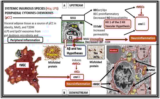 Upstream and downstream inflammatory effects on the development and progression of amyloid beta (Aβ) and tau in neurodegeneration. Upper panel (A) (upstream) depicts the effects of peripheral systemic injurious injuries such as homocysteine and lipopolysaccharides and peripheral cytokines and chemokines (pCC) and their effects on the neurovascular unit (NVU) that results in brain endothelial cell activation and dysfunction (BECact/dys) in conjunction with blood–brain barrier dysfunction and disruption (BBBdd) providing Hit 1 of the 2-Hit vascular hypothesis. Lower panel (B) (below the horizontal dashed line is downstream) depicts the central importance of downstream Aβ and tau misfolded proteins that comprise Hit number 2 of the 2-Hit vascular hypothesis. Importantly, note the activation of microglia cell to reactive microglia cells (rMGCs) depicted on the far left and also the activation of astrocytes to reactive astrocyte (rACs) that are detached and retracted (drACs) from the NVU basement membrane on the far right of this image. Note that the rMGCs in the far-right image of the neurovascular unit appear to be invasive in addition to being attracted to the NVU that associate with detached and retracted drACs. Also, note that this image incorporates the vascular hypothesis in that it depicts hit-1 of Zlokovic’s 2-hit hypothesis in the upstream panel (A) [93,94]. aMT, aberrant mitochondria; BEC N, brain endothelial cell nucleus; CBF, cerebral blood flow; CCH, chronic cerebral hypoperfusion; cnsCC, central nervous system cytokines–chemokines; EC N, brain endothelial cell nucleus; MetS, metabolic syndrome; NFTs, neurofibrillary tangles; Pc N, pericyte nucleus; T2DM, type 2 diabetes mellitus.